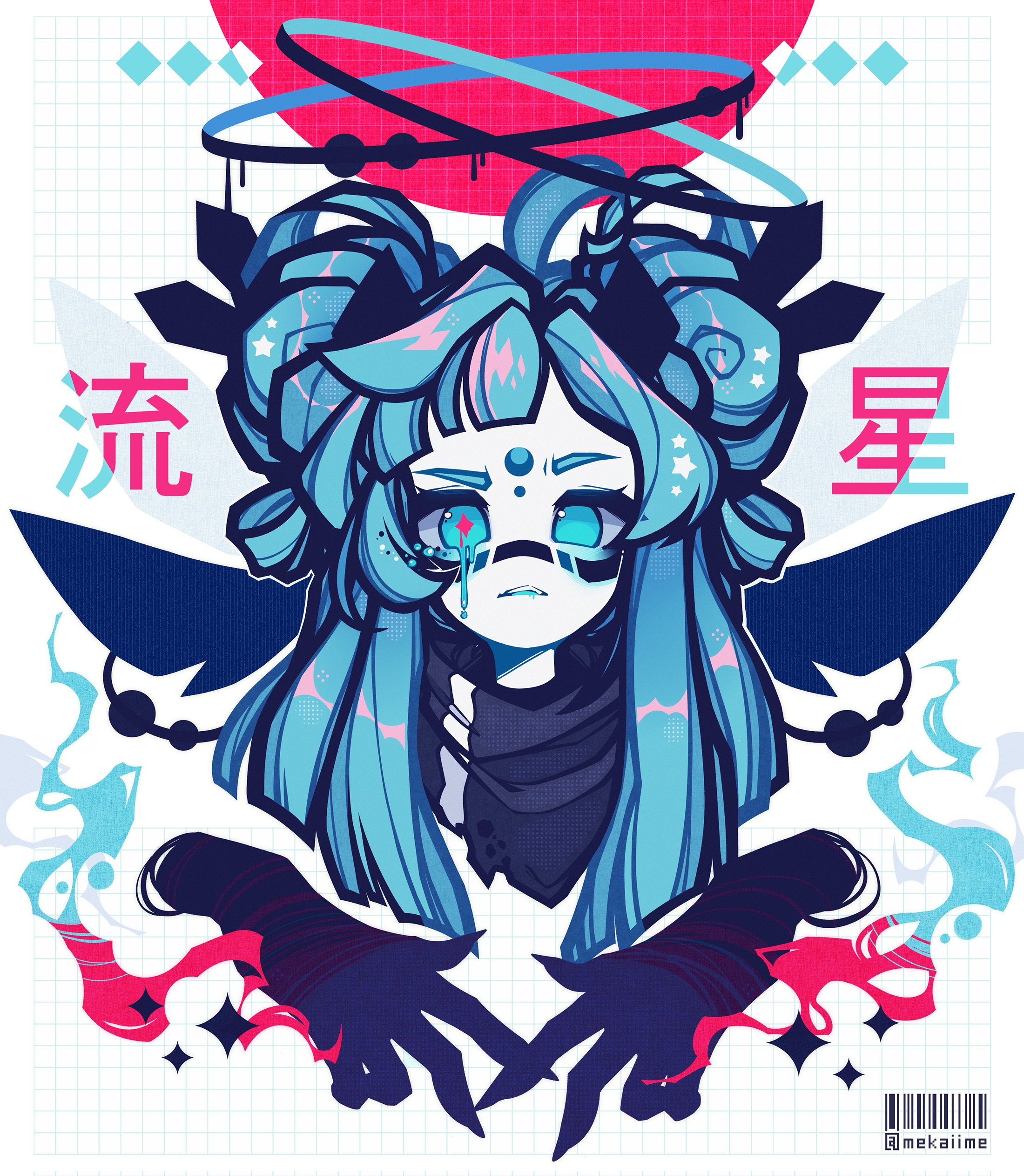 Сейчас очень популярен дизайн с использованием укороченных версий вещей, например укороченный худи, надетый поверх купальника, с рукавами, просто надетыми на руки, с штанами, от которых остались только нижняя и верхняя части, и так далее. В моём дизайне я вдохновлялся работами Mekaiime (например: 1, 2), а также новыми дизайнами Geoxor'а (например: 1, 2, 3), кто раньше использовал дизайны Mekaiime для обложек альбома. Дизайн использует цветовую палитру канонического дизайна, а также использует большие пучки волос, напоминающие 2 больших хвоста из дизайна персонажа сайта, а также немного напоминающий уши фурри из анимейшн мемов, по расположению и объёму.